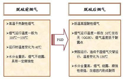 煙氣經過脫硫后,雖然煙氣中的二氧化硫的含量大大減少,但是,洗滌的方法對除去煙氣中少量的三氧化硫效果并不好。由于經濕法脫硫,煙氣濕度增加、溫度降低,煙氣極易在煙囪的內壁結露,煙氣中殘余的三氧化硫溶解后,形成腐蝕性很強的稀硫酸液。